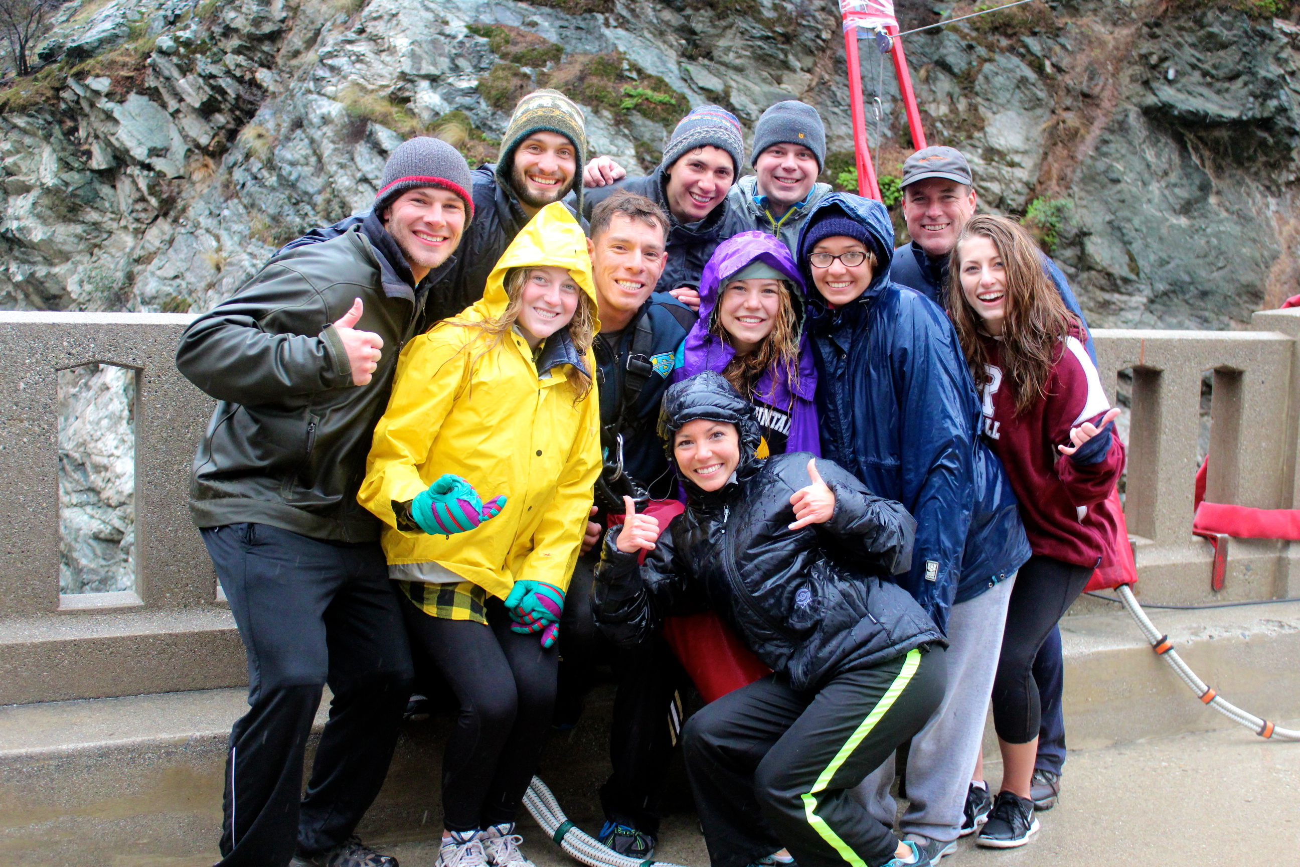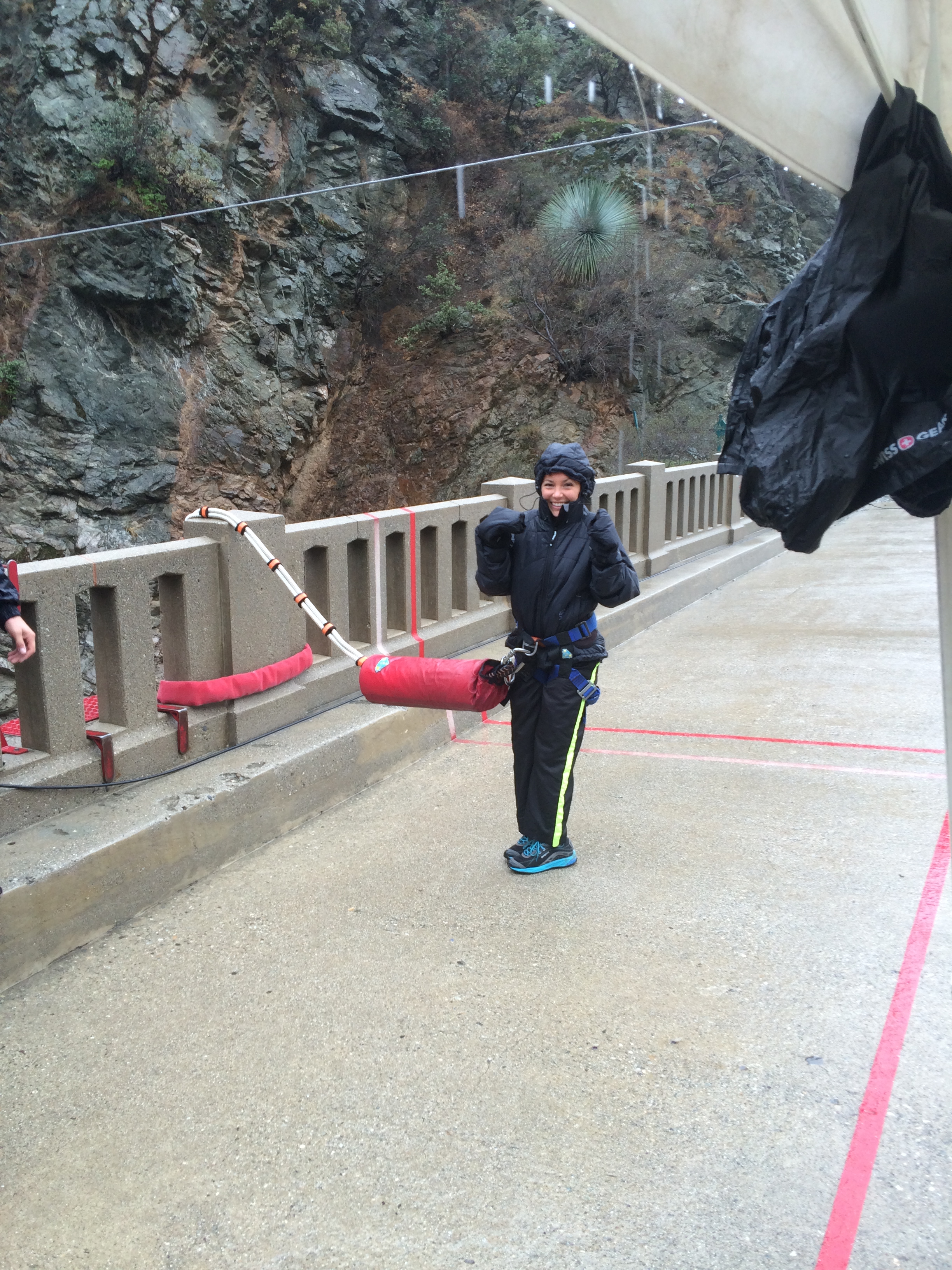 The constant drizzle didn’t seem to bother anyone as the day began but as we gain in elevation and the wind picks up it becomes a nuisance.  With our destination in sight, I start to feel as if I have earned the right to jump off the bridge since I just trekked five miles in the rain to get there.  At that moment, I realize I may be crazy.  I’m terrified of heights and I’m looking forward to diving head first off the side of a bridge into a canyon?  It has been confirmed, I have officially lost it!