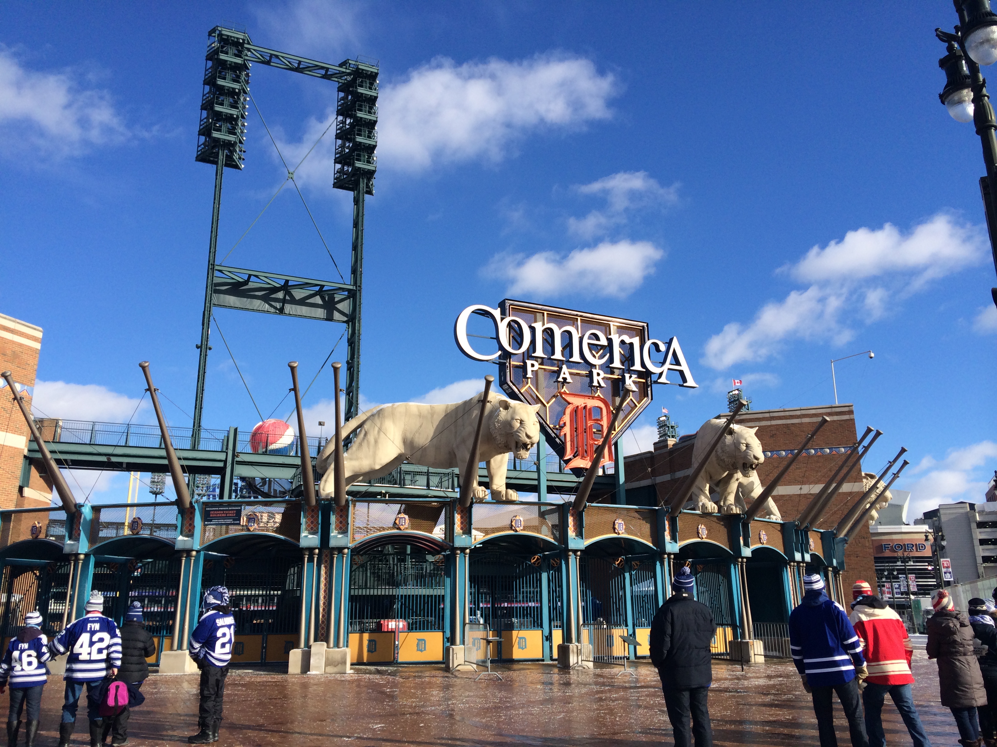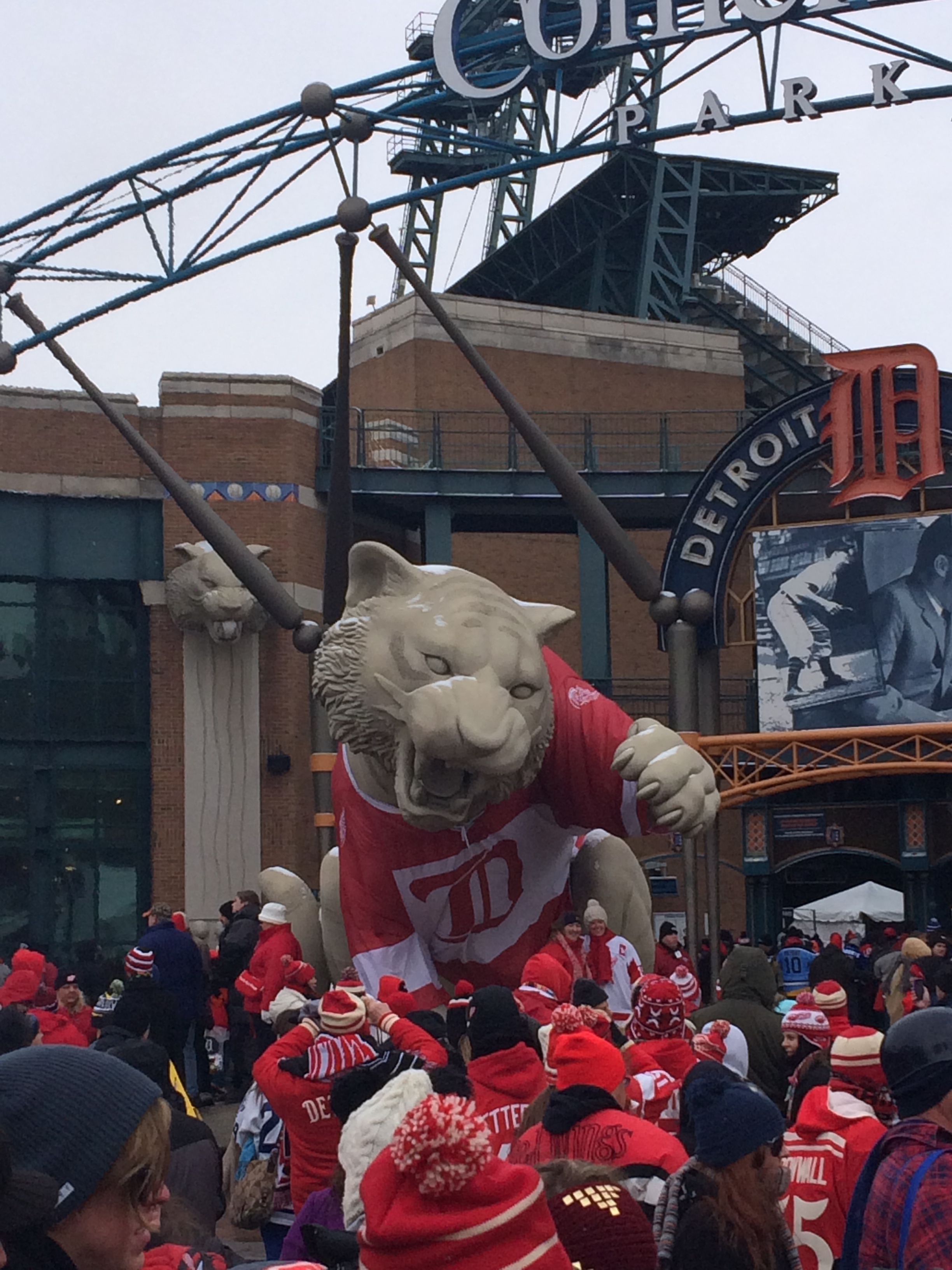 As we arrive in Detroit around 10:30 AM, I direct Eddie to my “secret” parking spot one block from Comerica Park. After parking, I put on the final 3 layers of my outfit in attempts to battle the 15 degree weather. We spent the next two hours in the Hockeytown Winter Festival Fan Zone playing bubble hockey, air hockey, and having a target shooting skills competition, which I just so happened to win!