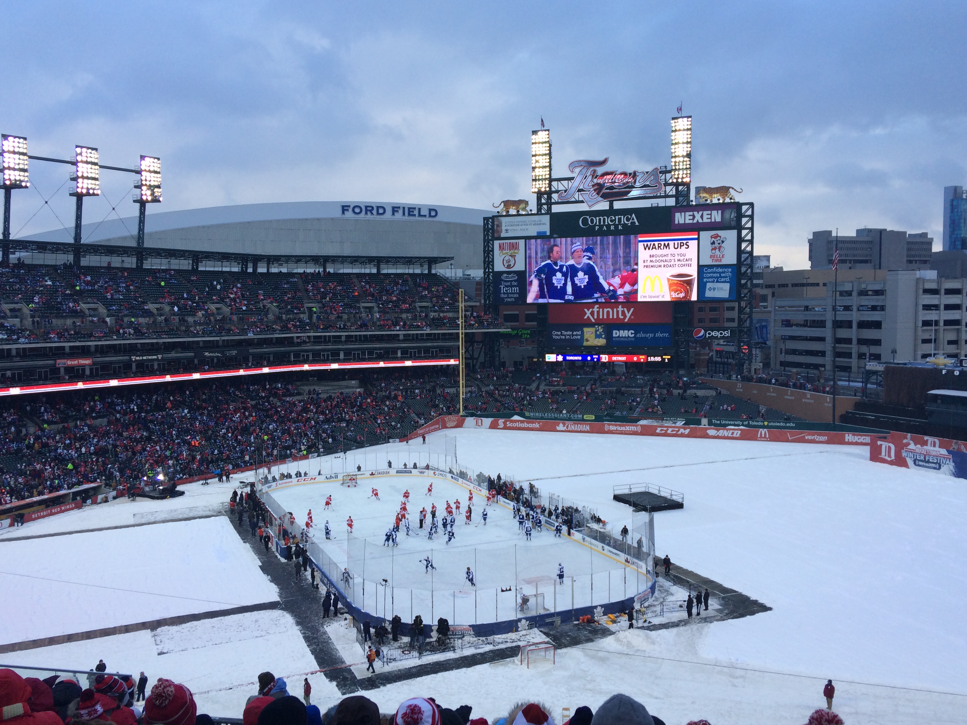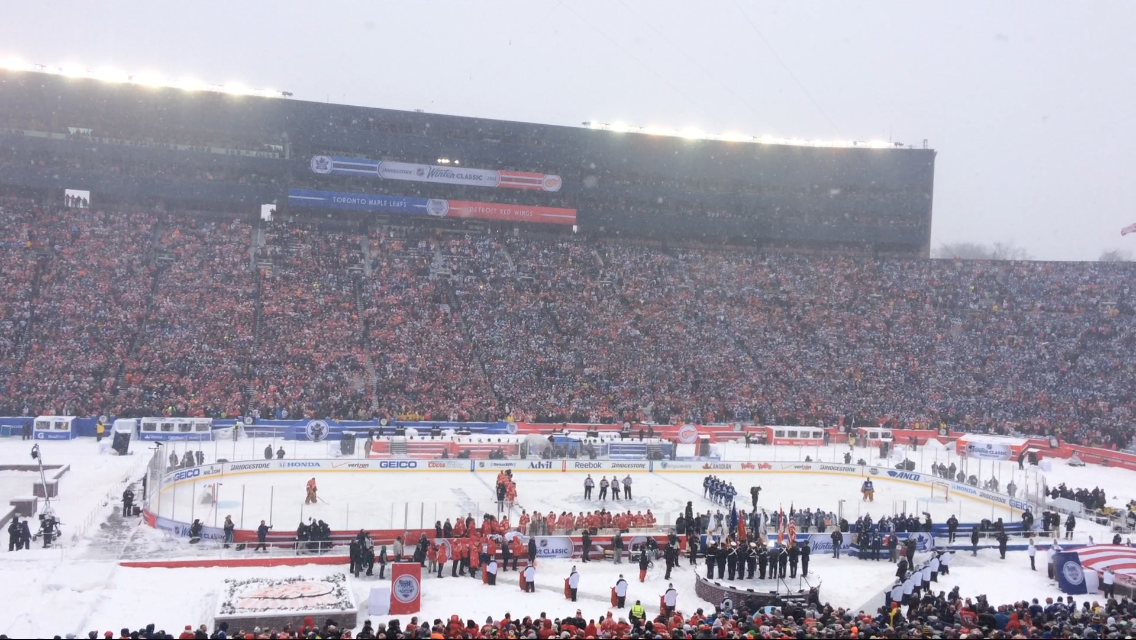 Soon after sitting down, the visiting Toronto Maple Leafs and home team Detroit Red Wings take the ice in front of a record setting 105,491 screaming fans. The national anthem is performed by Grammy Award-winning Zac Brown Band. The atmosphere in the stadium is intoxicating. For the next 3 hours all I want to do is lace up my skates and play hockey. Even the cold weather and constant barrage of snow could not change that feeling. Unfortunately, I’m confined to the stands and must watch the professionals.